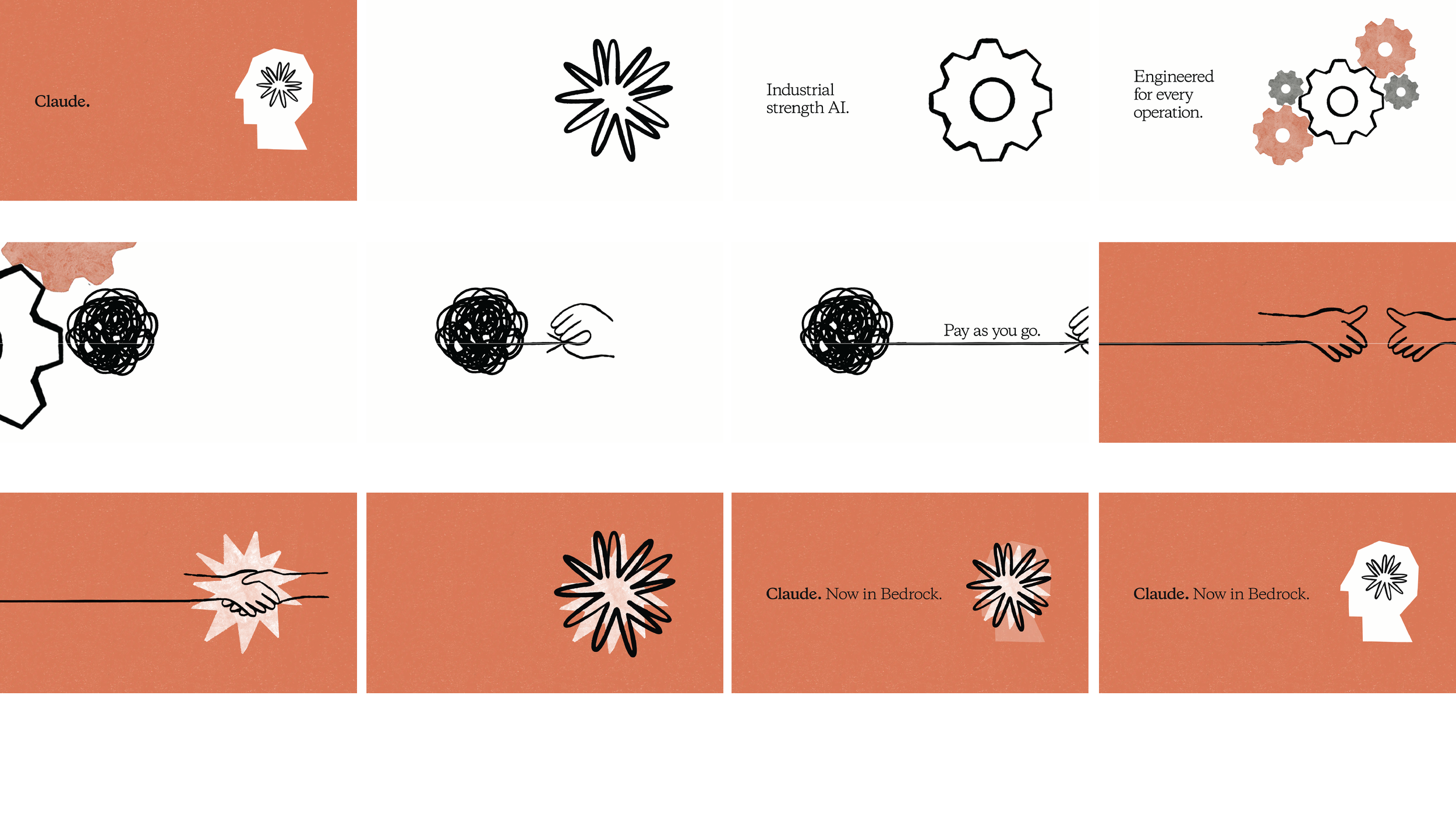 The system alternated between terracotta and cream backgrounds to create visual variety while maintaining coherence across placements. A subtle paper texture introduced warmth against the precision of the digital animation.