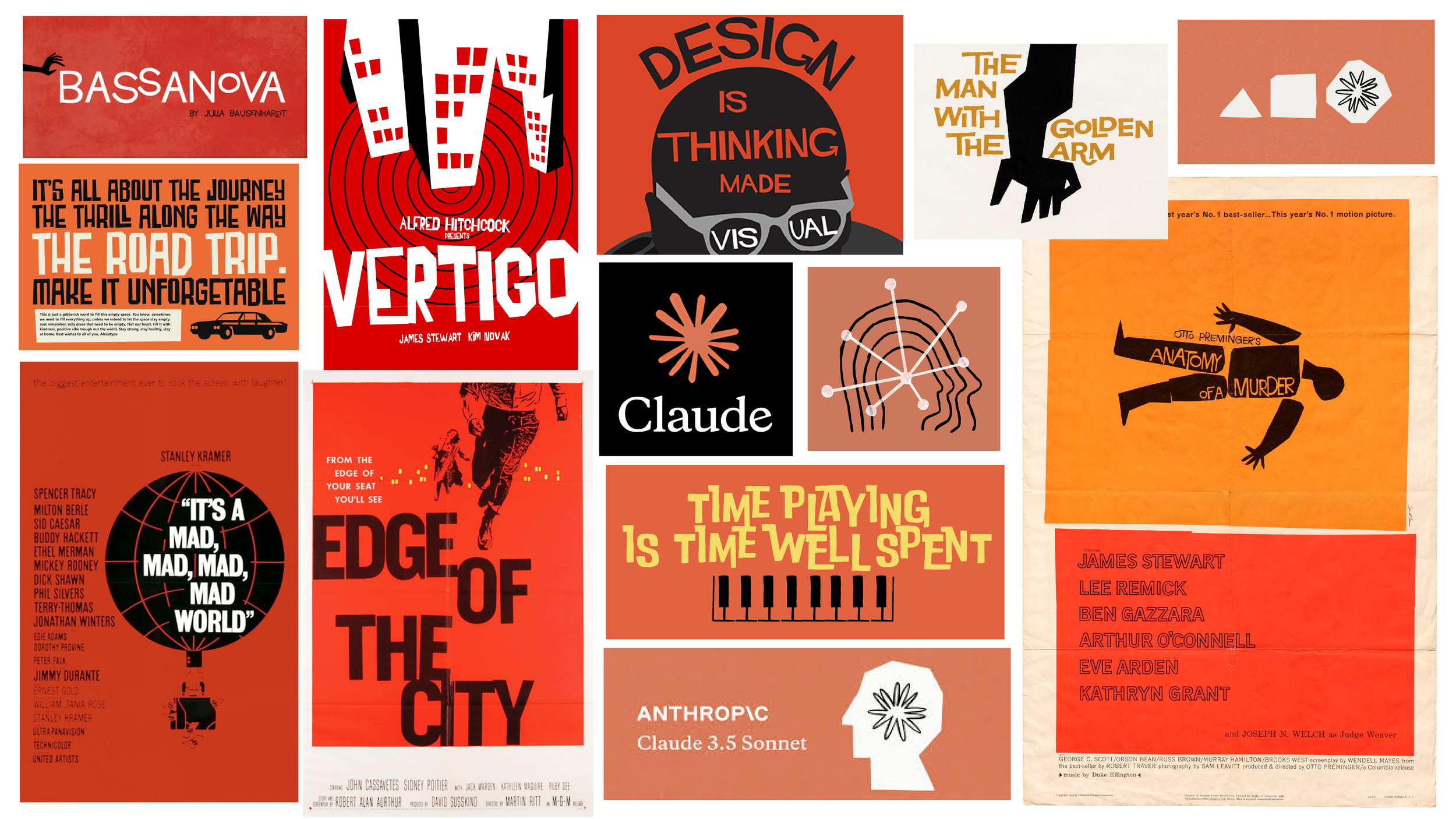 Bass’s work — particularly the title sequences and poster campaigns he designed for filmmakers like Hitchcock and Preminger — communicates complex ideas through simple graphic shapes, bold colour, and typography treated as image. The approach felt directly relevant to the challenge: clear, confident, immediately legible, and dramatically different from the default visual language of AI marketing.